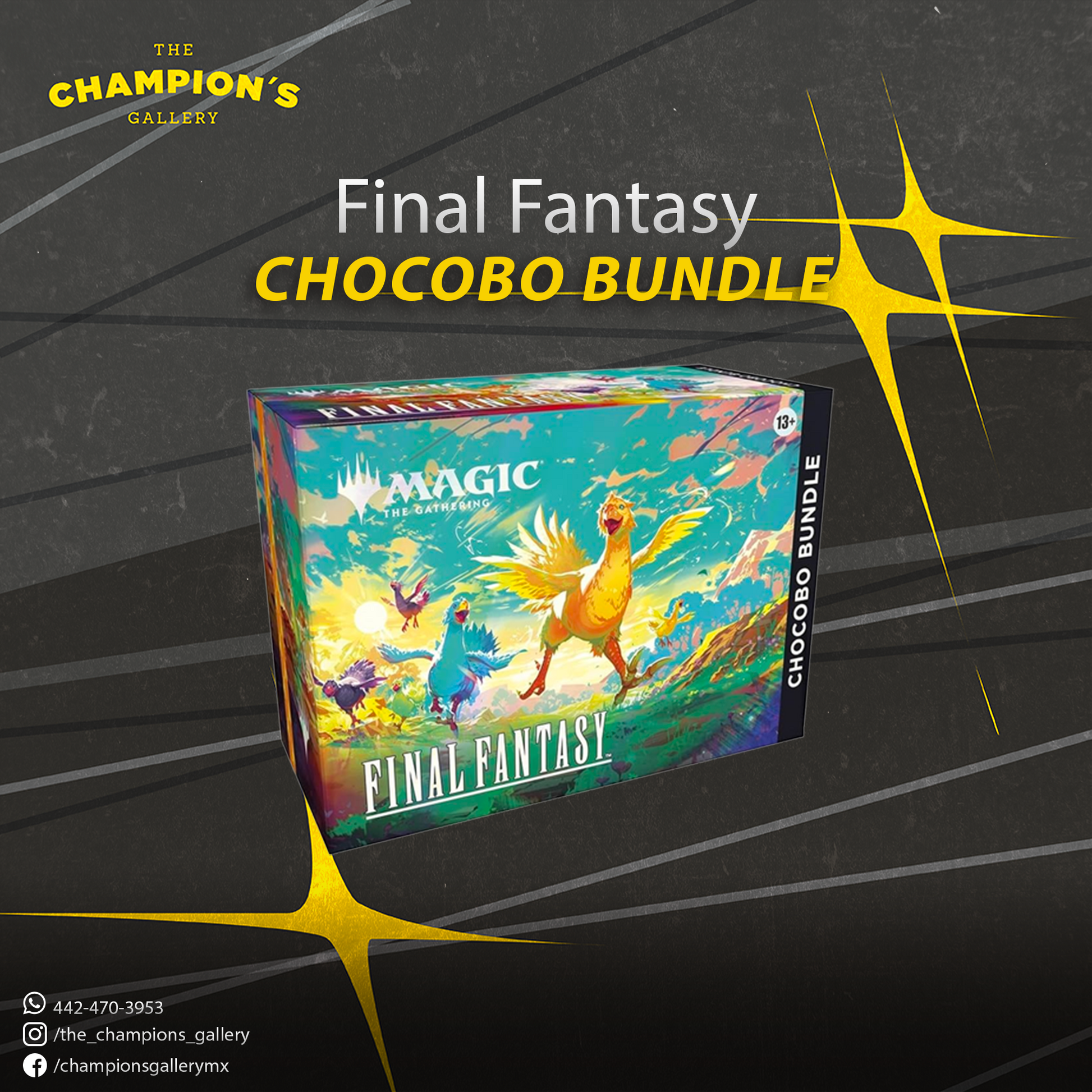 🔹 1 Chocobo Booster (12 cartas): contiene 10 tierras básicas Full-Art de Chocobo y 2 cartas sin borde del Chocobo Bundle de rareza rara o superior.